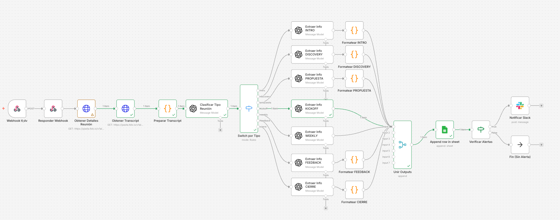 Sabiendo lo que quería obtener de cada tipo de reunión, creamos un flujo en n8n que apenas finaliza una llamada, procesa el transcript y extrae la información que para nosotros es importante, y la registra en un Google Sheet.